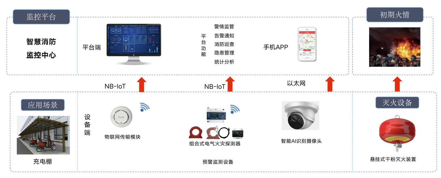 电动车统一充电管控,全天候温度、烟雾监测报警,一旦发现火情,平台及手机端及时报警推送。