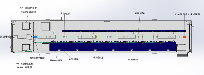 在集装箱内配置消防主机、监测模块以及红外可见光火焰探测器,监测到高温报警信号,集装箱可通过远程通信的方式进行声光报警,同时开启消防主机,通过多路单电池簇喷淋管道释放灭火介质进行灭火。当大面积热失控后,监测模块及红外可见光火焰探测器继续监测,火灾若没有得到有效控制,将再次通过管道喷射药剂直至完全灭火。