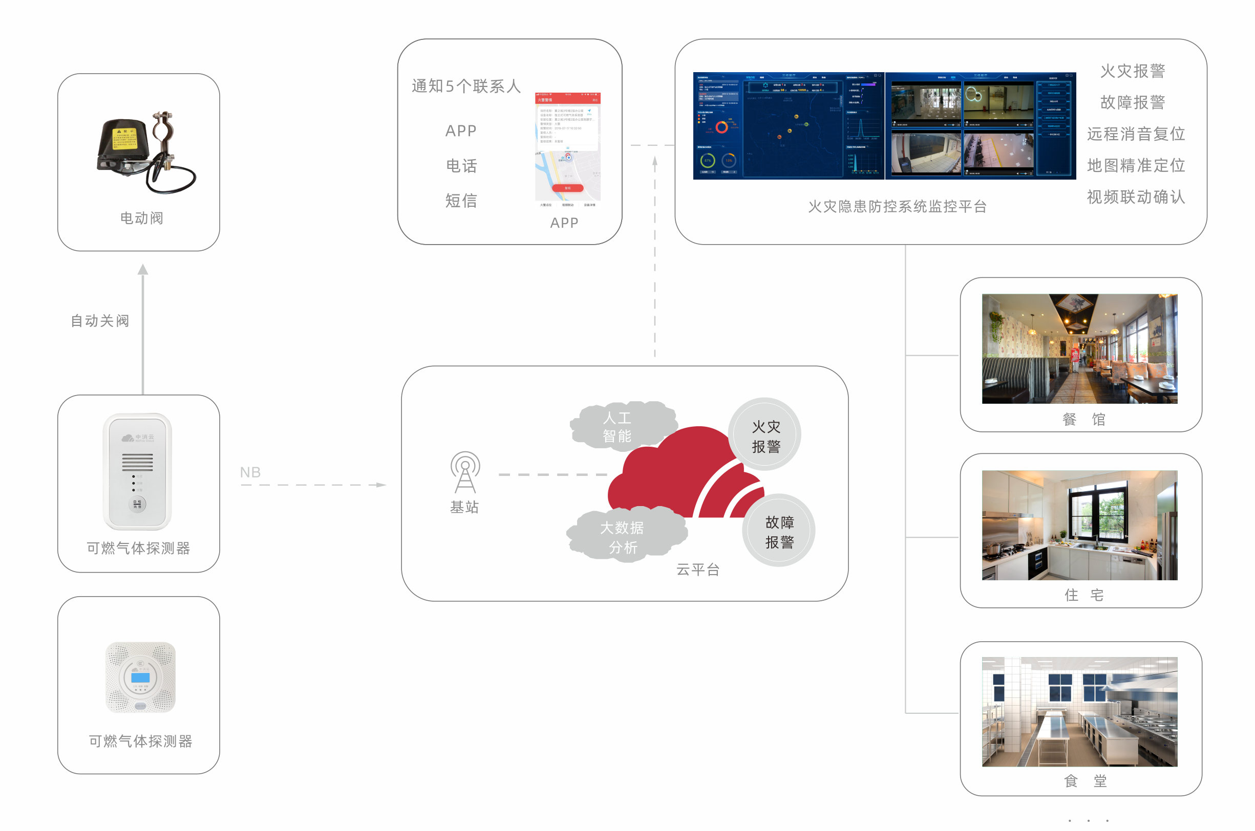 燃气安全智能监控系统由可燃气体探测器、电动阀或电磁阀、监管平台组成,可燃气体探测器可实时采集家庭住宅、小微餐饮场所以及饭店等区域的燃气浓度,当传感器检测到燃气浓度超标时,立即触发探测器本地声光报警,快速提醒周围人员,探测器报警的同时可联动电动阀或电磁阀关闭燃气阀,同时,报警信息通过语音电话、短信、APP推送等三种通知方式告知用户,实现火灾事故的早发现、早报警、早扑灭,避免因燃气泄漏造成的重大人员伤亡事故的发生。